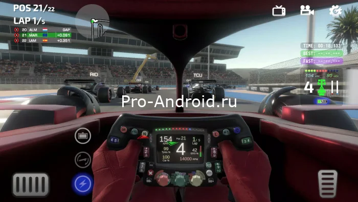 Управлять можно несколькими способами: наклоном устройства, стрелочками или с помощью виртуального руля. Настроек много, так что каждый найдёт удобный вариант. Правда, физика болида требует привыкания — на высоких скоростях машина реагирует остро, и малейшая ошибка может стоить позиции.