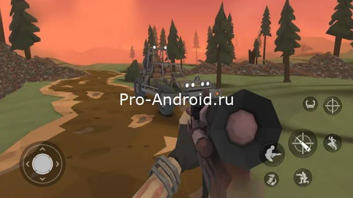 Визуально игра выполнена в полигональном стиле — угловатые модели, яркие цвета, чёткие текстуры. Выглядит современно и работает даже на слабых телефонах. В настройках можно подкрутить графику под свой девайс — отключить тени, снизить детализацию, уменьшить дальность прорисовки.